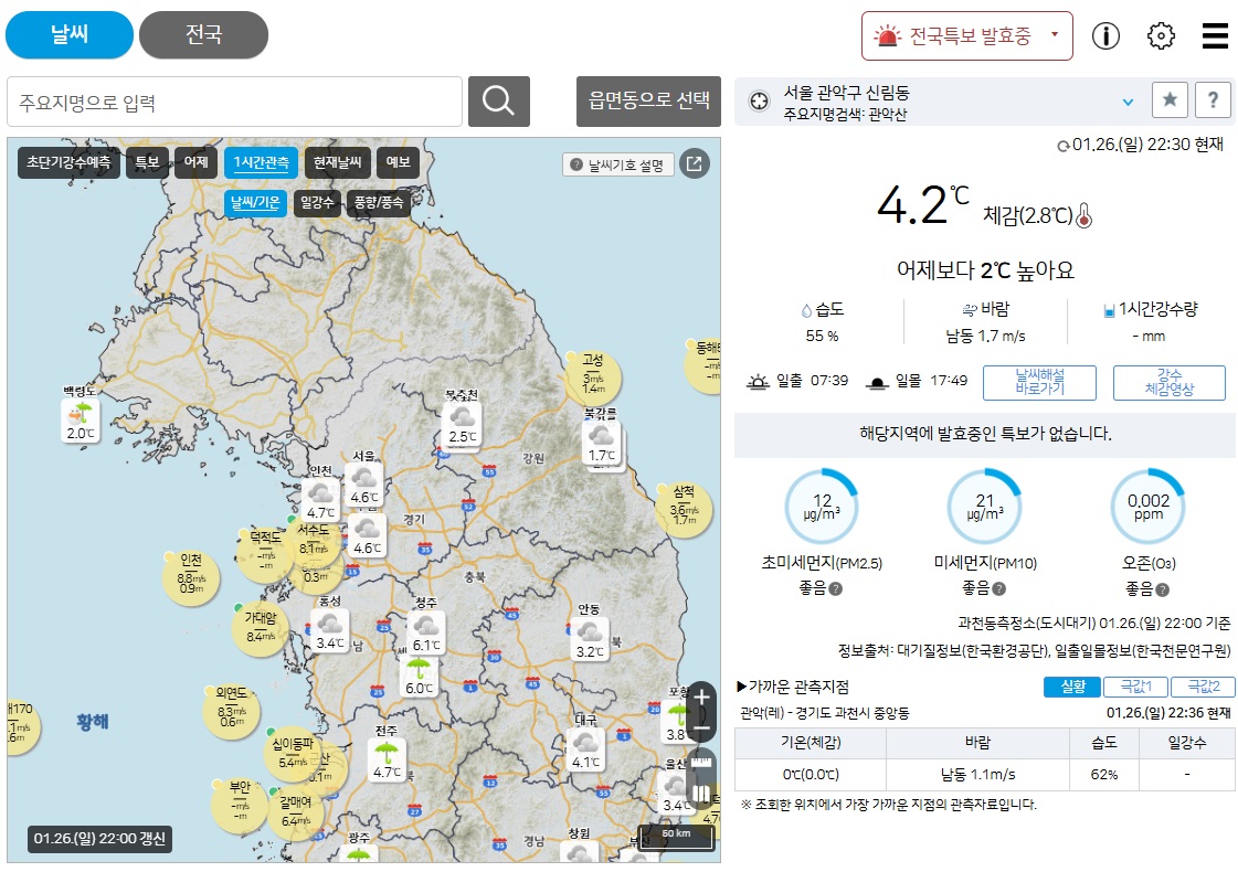 특보 및 경고: 기상특보(예: 폭염, 한파, 강풍 등)를 통해 위험한 날씨 상황을 미리 알림 받을 수 있습니다.