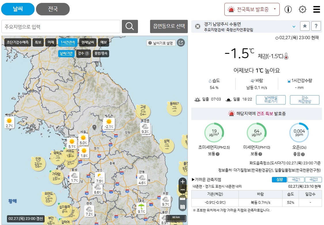 특보 및 경고: 기상특보(예: 폭염, 한파, 강풍 등)를 통해 위험한 날씨 상황을 미리 알림 받을 수 있습니다.