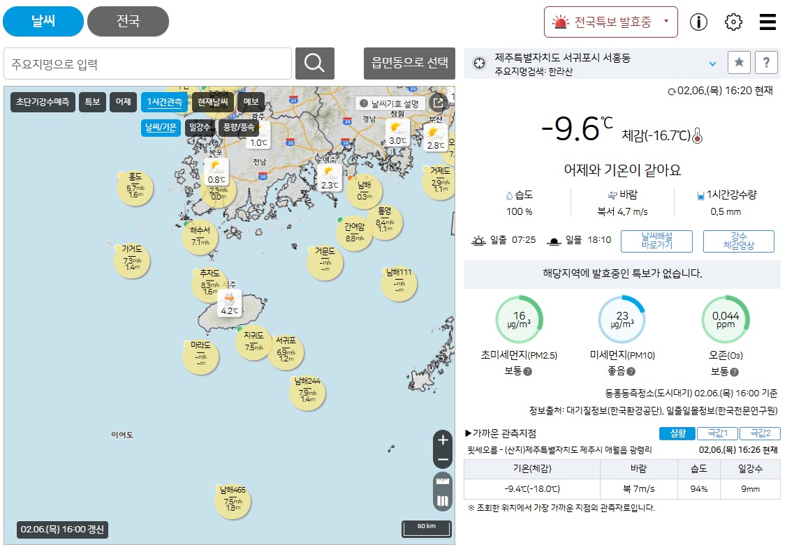 특보 및 경고: 기상특보(예: 폭염, 한파, 강풍 등)를 통해 위험한 날씨 상황을 미리 알림 받을 수 있습니다.